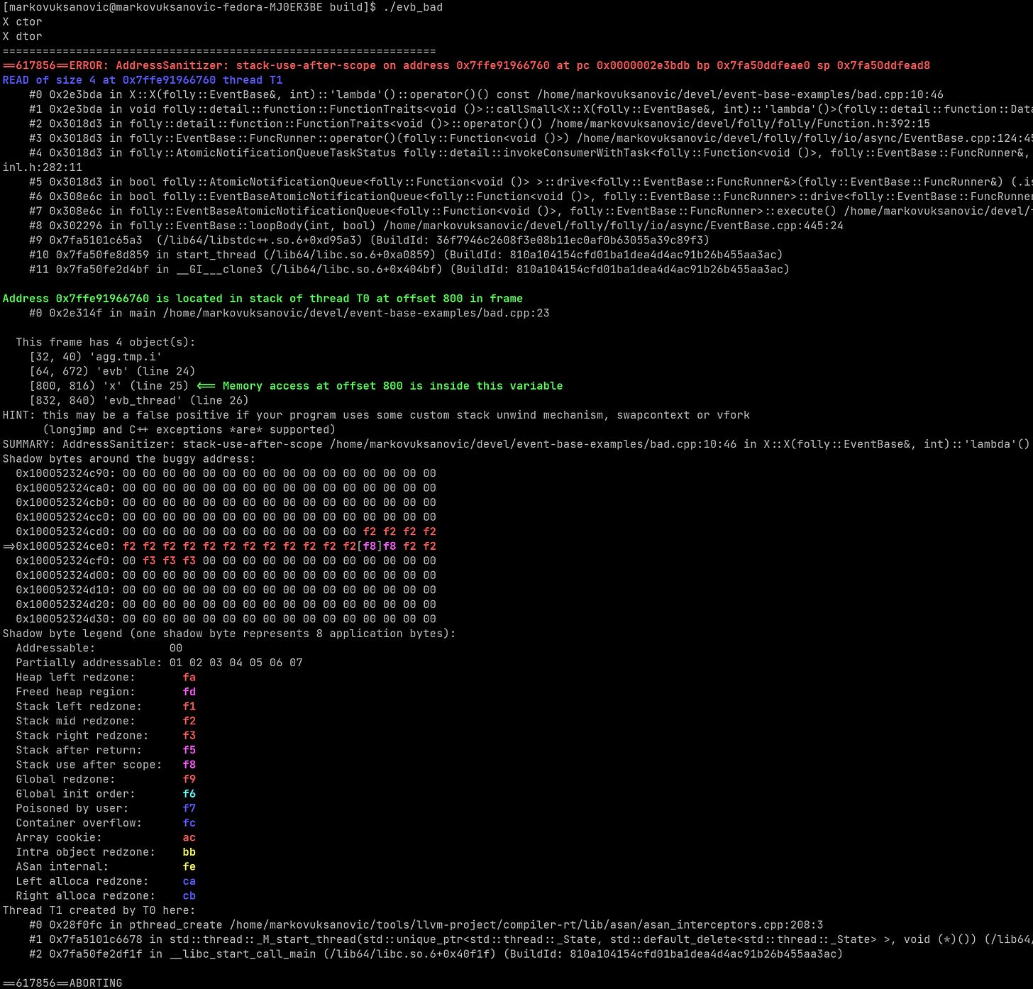 Here something very interesting happens. When the task is placed onto the EventBase lambda implicitly captured `this` and `value_`. Since the object is destroyed in line 22 (that’s where x goes out of scope) when the EventBase runs our task we step into a danger zone. If you’re lucky and use sanitizers to validate programs you will get an error like this: